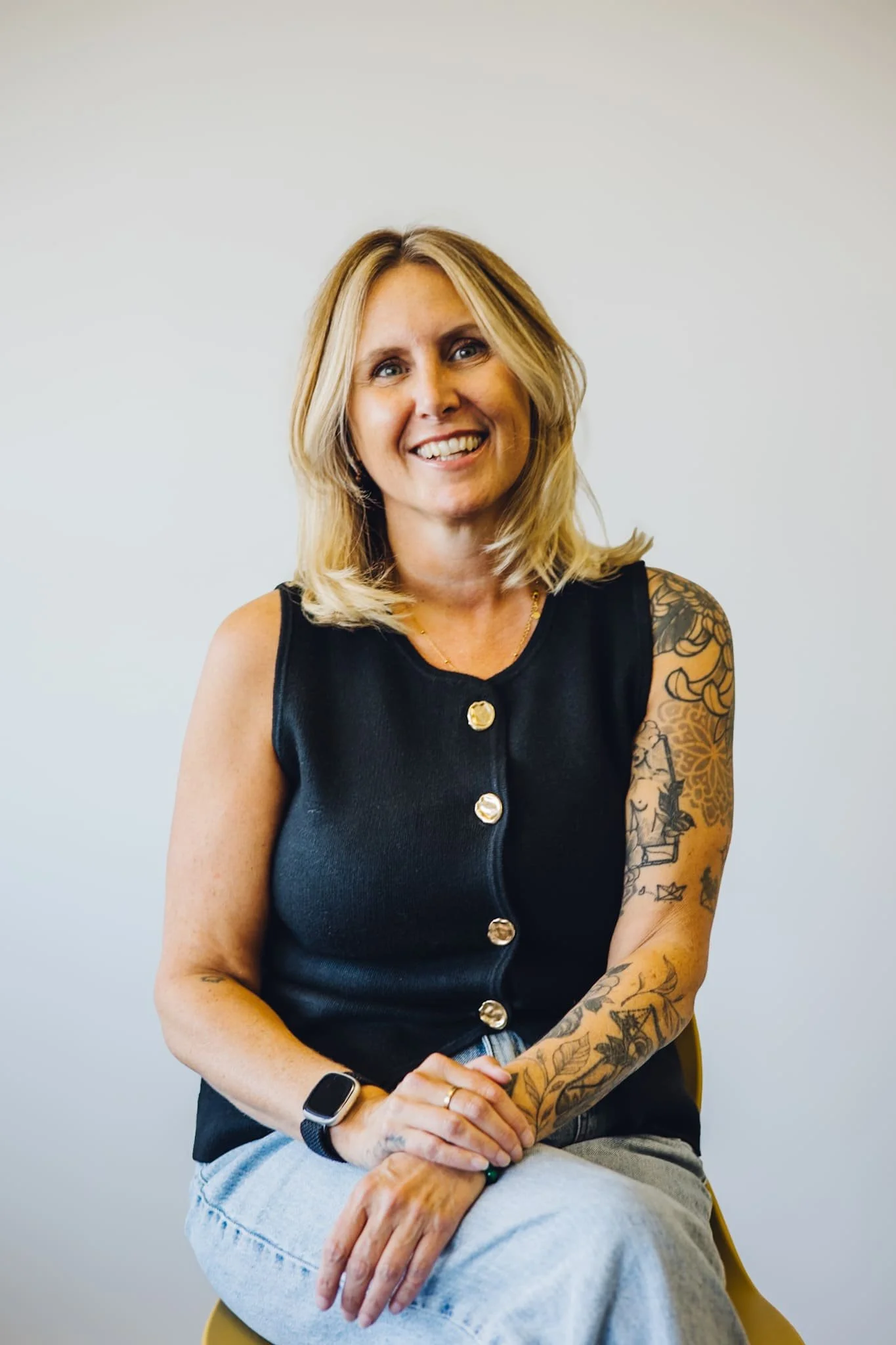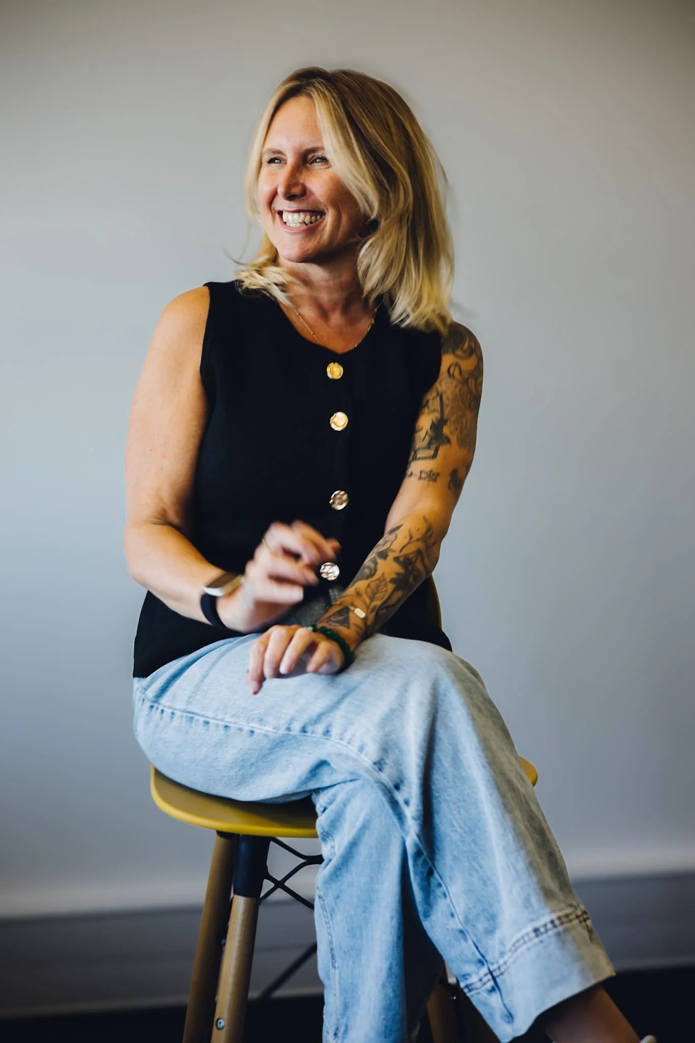 Woman with blonde hair, wearing a sleeveless black top with gold buttons and light blue jeans, sitting on a yellow chair, smiling and looking to the side.