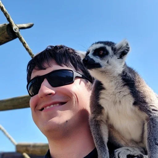 Person smiling with sunglasses next to a lemur on their shoulder outside under a clear blue sky.