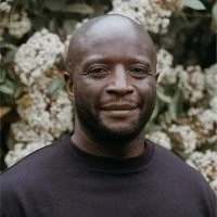 A man with dark skin and a shaved head standing outdoors with white flowers in the background.