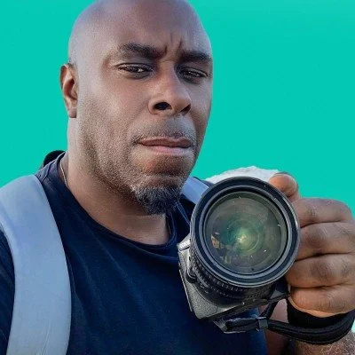A man with a serious expression holding a camera, wearing a backpack, with a bright turquoise background.