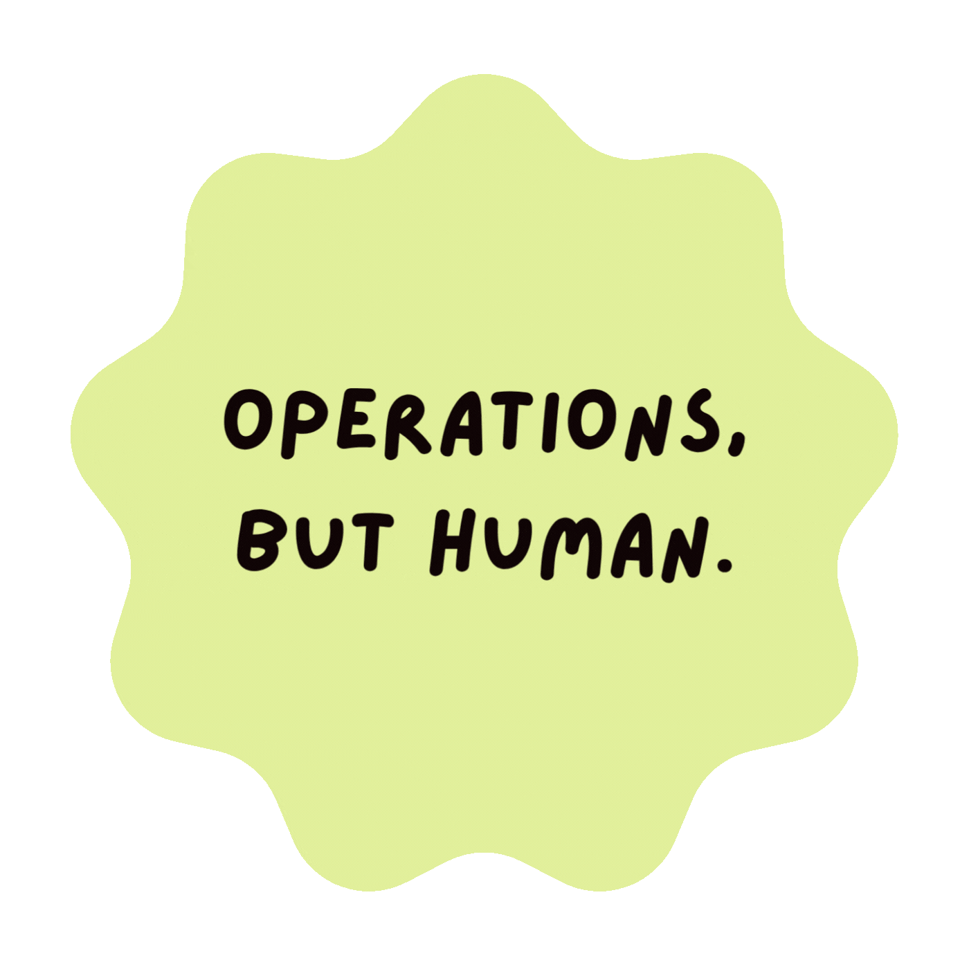 Text saying, 'Operations, but human.' on a light yellow background with a darker beige shape behind the text.