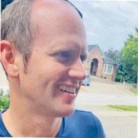 Close-up of a smiling man with short brown hair, wearing a blue shirt, outdoors in front of houses and trees.